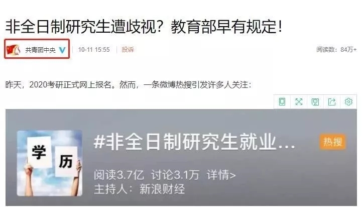 去年10月考研報(bào)名前夕,#非全日制研究生就業(yè)遭歧視# 話題引爆網(wǎng)絡(luò),話題閱讀量近4億,約28萬人參與討論。隨后,共青團(tuán)中央、人民日?qǐng)?bào)、央廣網(wǎng)等接連轉(zhuǎn)載發(fā)聲,聲援非全日制研究生。