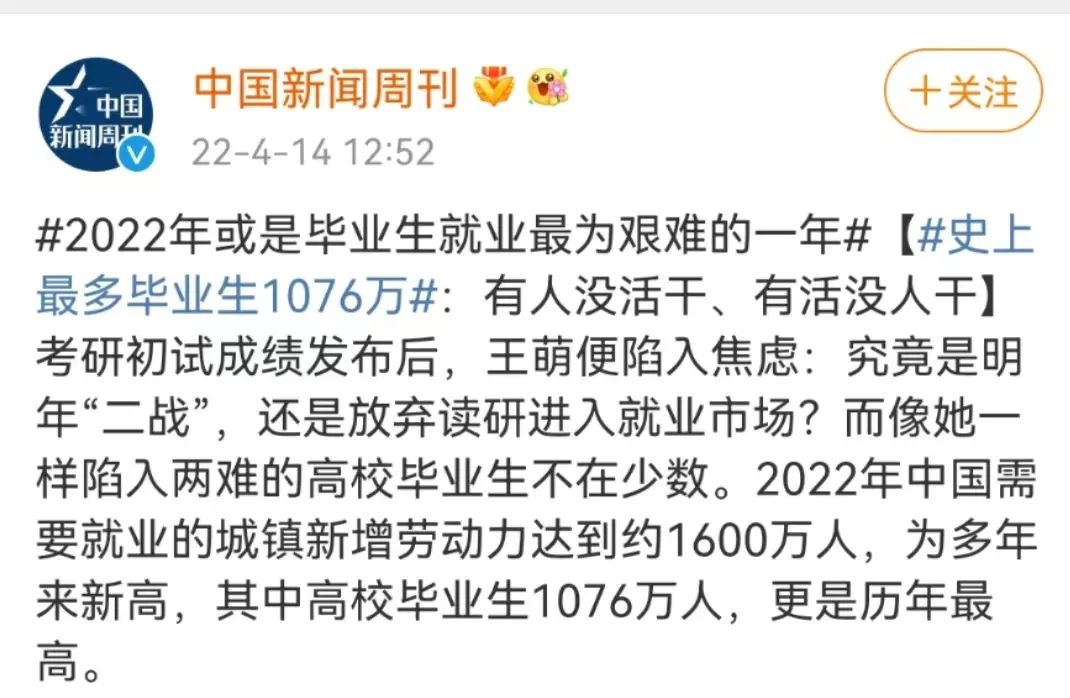 近日,一條關(guān)于“2022年畢業(yè)生達(dá)到1076萬”的話題沖上熱搜,對于任何賽道的人員來說都是一場不容忽視的沖擊。