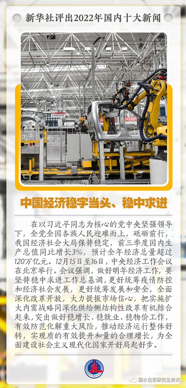 在以習近平同志為核心的黨中央堅強領導下,全黨全國各族人民迎難而上,砥礪前行,我國經濟社會大局保持穩(wěn)定,前三季度國內生產總值同比增長3%,預計全年經濟總量超過120萬億元。12月15日至16日,中央經濟工作會議在北京舉行。會議強調,做好明年經濟工作,要堅持穩(wěn)中求進工作總基調,更好統(tǒng)籌疫情防控和經濟社會發(fā)展,更好統(tǒng)籌發(fā)展和安全,全面深化改革開放,大力提振市場信心,把實施擴大內需戰(zhàn)略同深化供給側結構性改革有機結合起來,突出做好穩(wěn)增長、穩(wěn)就業(yè)、穩(wěn)物價工作,有效防范化解重大風險,推動經濟運行整體好轉,實現(xiàn)質的有效提升和量的合理增長,為全面建設社會主義現(xiàn)代化國家開好局起好步。