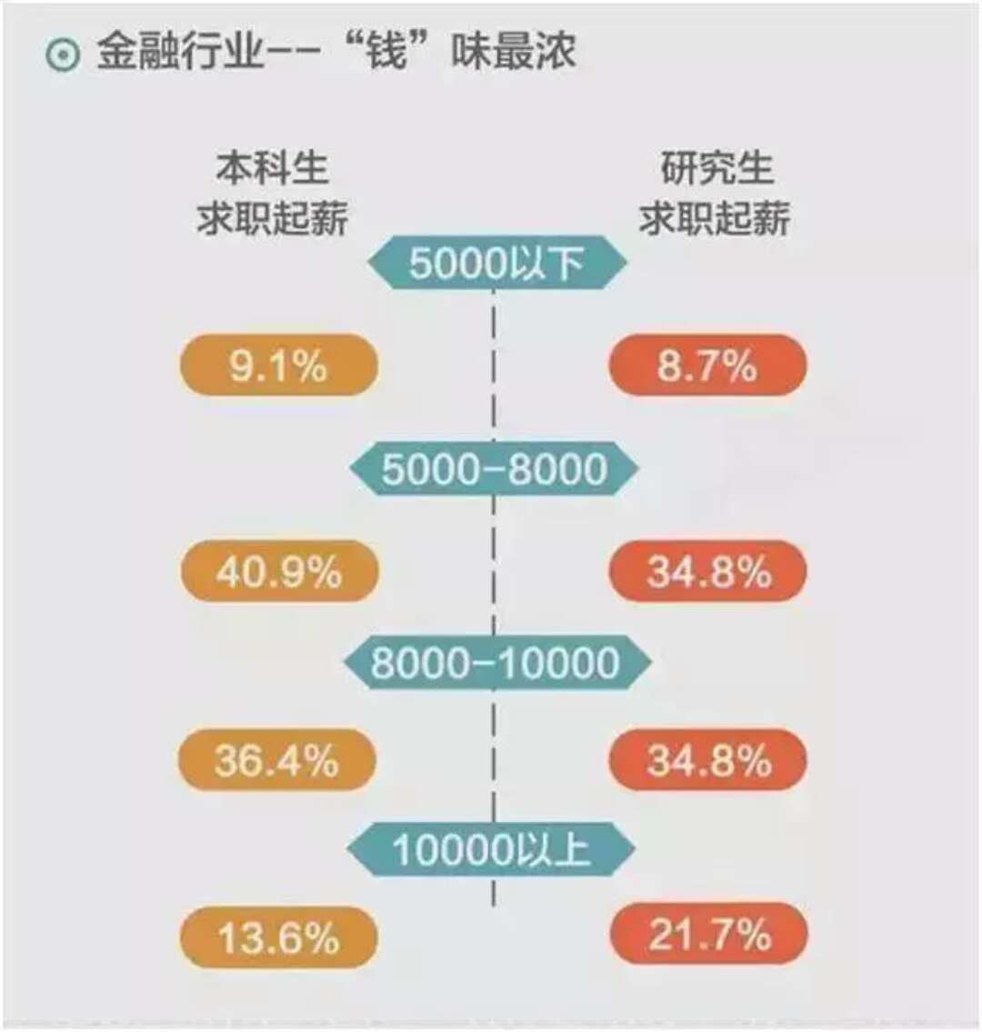 金融行業(yè):研究生平均工資達(dá)到13000~14000,本科生平均6000~7000,差不多高出100%;