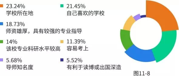 分析:從調查結果可知,學校所在地和本人對報考院校的心儀程度是大部分考生選擇報考選校的重要因素。同時,師資情況和學??佳兴降母叩偷溶浖l件也是考生們非常關注的因素。
