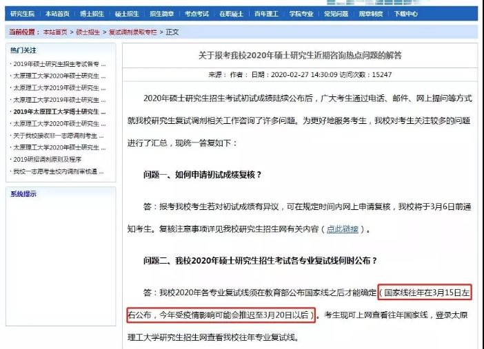 太原理工大學在研究生招生信息網(wǎng)上公布,原定于3月15日公布國家線,有望推遲至3月20日公布。